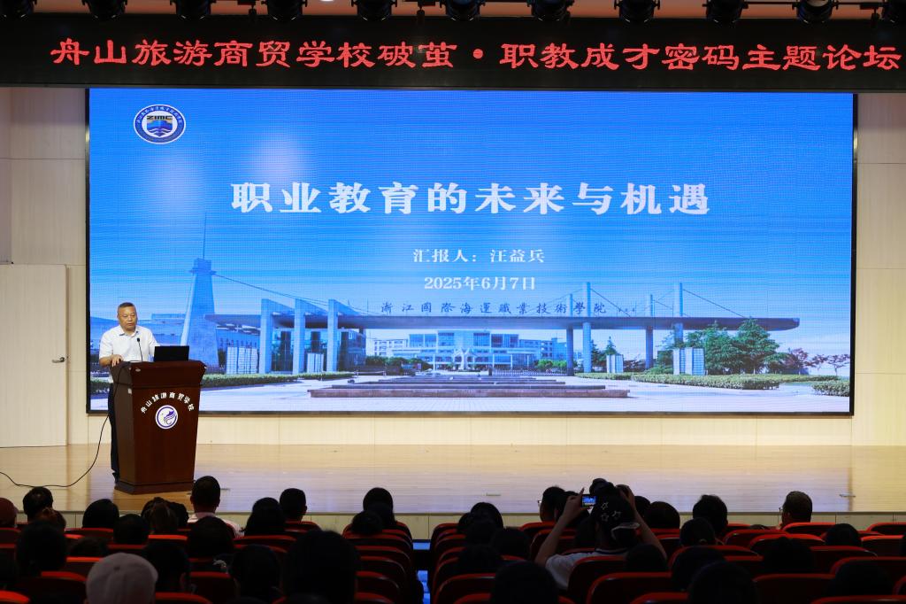 6月7日,舟山旅游商贸学校隆重举办校园开放日暨技能节活动,来自舟山市初三学子与家长代表、相关行业企业代表共同参与了“破茧·职教成才密码”主题论坛活动,沉浸式体验职业教育改革硕果。我校航海工程学院院长汪益兵教授应邀参加并做“职业教育的未来与机遇主题讲座