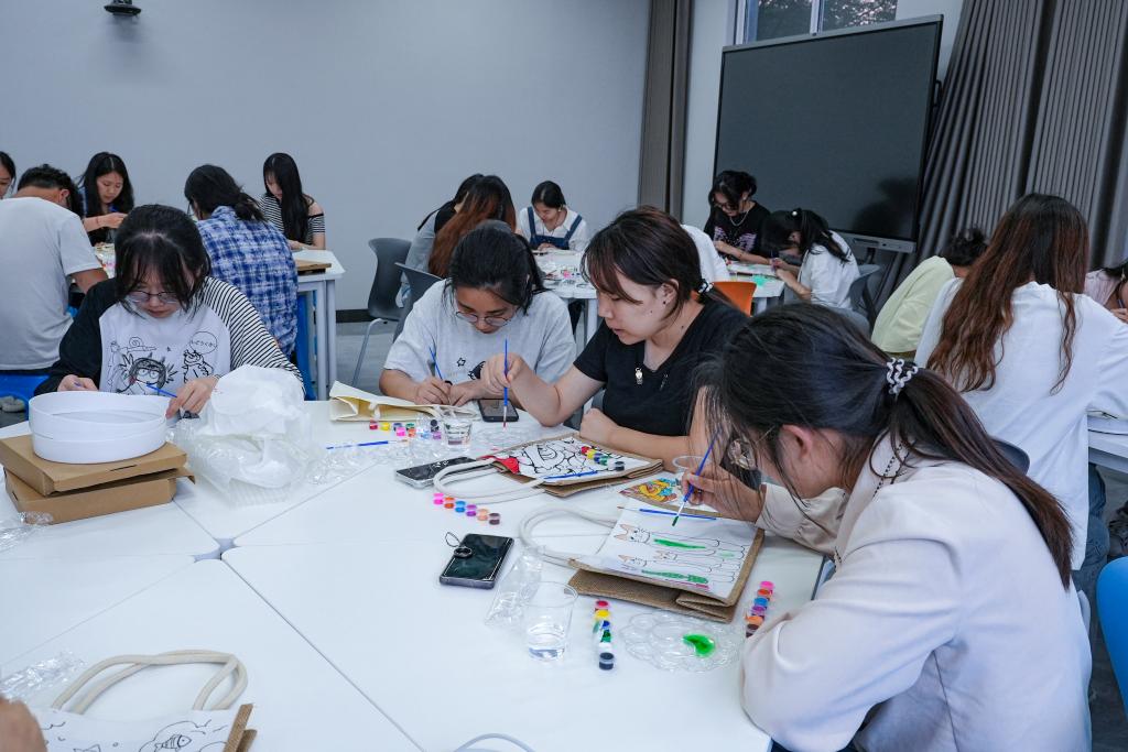 国际教育学院举办了“心灵手绘”创意绘画,学生通过涂鸦时钟、麻布包DIY等形式表达情绪、放松身心。