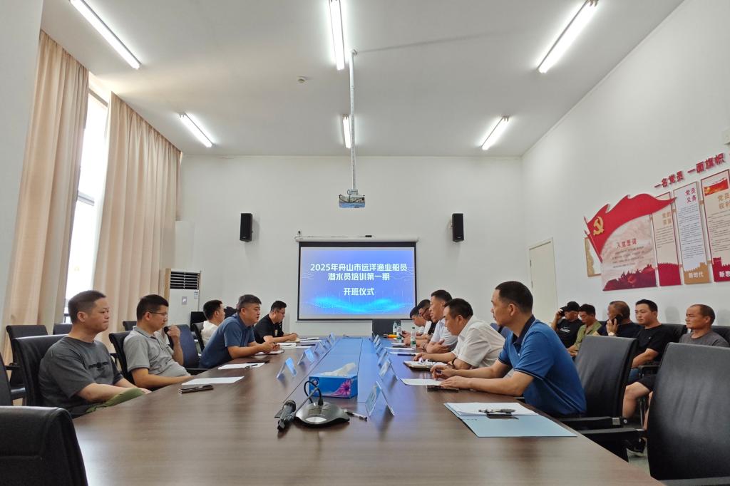 7月10日上午,舟山市远洋渔业潜水员首期培训班开班仪式在我校体育馆二楼会议室举行。市海洋渔业经济发展局远洋渔业处处长张鸿宾、浙江省渔业互保舟山办事处主任董海斌等领导出席会议,我校党委委员、副校长夏志刚,文化体育部部长王智明及相关人员和来自全市各远洋渔业公司的12位学员参加了开班仪式,会议由王智明主持。