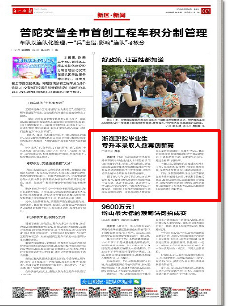 据了解,今年,该学院共有235名毕业生报考,最终109名毕业生分别被浙江工业大学、浙江工商大学、浙江理工大学、浙江中医药大学、中国美术学院、宁波大学、杭州电子科技大学等30余所省内本科院校录取。专升本录取人数在去年大幅增加的基础上又提升了16%;其中港口管理学院2018届毕业生被录取69名,比去年增加23名,录取率为65.09%,超过全省平均录取率。