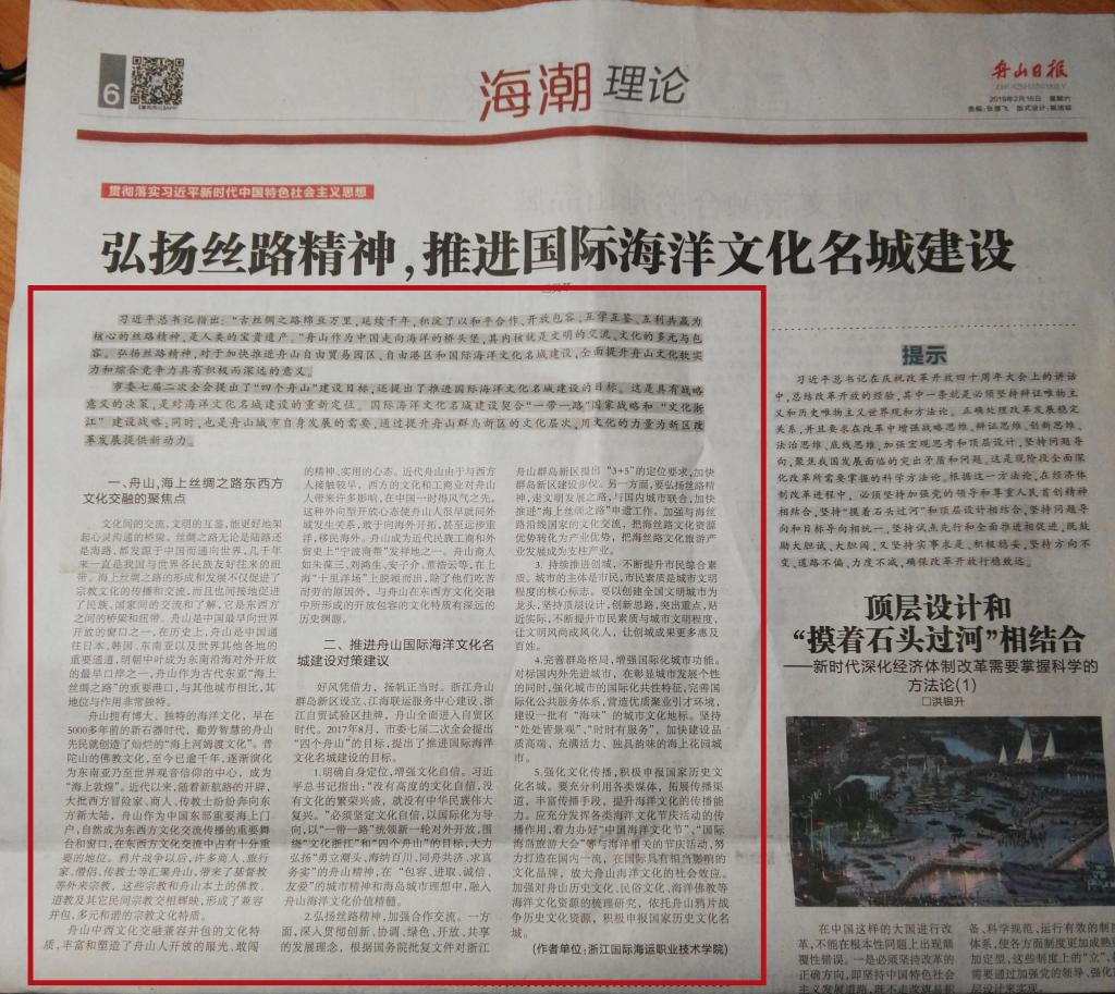 好风凭借力, 扬帆正当时。浙江舟山群岛新区设立、江海联运服务中心建设、浙江自贸试验区挂牌,舟山全面进入自贸区时代。2017年8月,市委七届二次全会提出 “四个舟山”的目标,提出了推进国际海洋文化名城建设的目标。