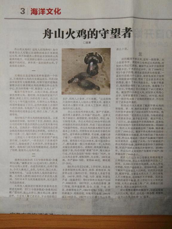 据舟山市志介绍,火鸡民国初本岛各乡多有饲养,盐仓、洞岙、紫微居多,每岁终运往上海约3万羽,供欧美人圣诞节食用。民国36年(1947)洞岙、干览、马岙、紫微、岑册、及芦浦(现属普陀)等6乡饲养火鸡农户3120户、8000余羽。1957 年后,火鸡销香港、澳门等地,饲养量渐增,盐仓、石礁、干览、荷花、老碶等地主产,1966年收购1万羽。后因外销量少、收购价低,本地不习食用,1985年减至300余羽。1987年后仅石礁乡外山头留养几十羽。