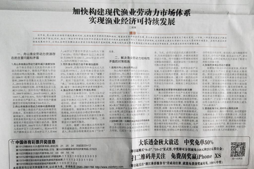 舟山海洋捕捞产量约占全省的40%、全国的10%,舟山渔业在全国有着举足轻重的地位,有“中国渔都”的称号。目前,舟山市渔业经济仍是舟山经济支柱产业,占全市GDP总量10%左右,全市与渔业产业链相关人口达40万。因此,从某种意义上讲,渔业是舟山经济的“晴雨表”,社会稳定的“压舱石”。要加快推动渔区经济转型,以渔业供给侧结构性改革为重点,在大力发展养殖业和远洋渔业的同时,积极发展休闲渔业、海钓、“互联网+渔业”等新业态,延长产业链、提升附加值,并根据产业发展需要,适时调整劳动力政策,通过控量提质、调整结构、外引内培等方式,有计划地培养建设一支素质好的渔业捕捞队伍。