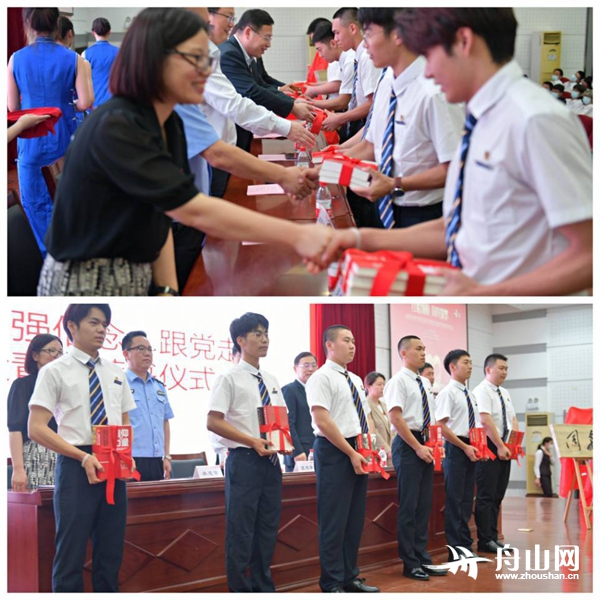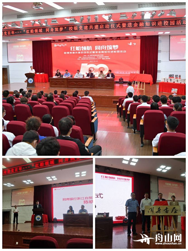 浙海职院船舶工程学院党总支和招商银行舟山分行第一党支部现场签订了党建共建合作协议,校银双方后续以党建为引领,推动校地、校企合作,共同探索培养拔尖创新人才的新途径。启动仪式上,浙海职院、市公安局、银保监分局、招商银行舟山分行的各位领导共同为浙海职院“同舟书屋”进行了揭牌仪式并现场为优秀团员学生推荐了《习近平的七年知青岁月》《红船精神》等红色书籍。