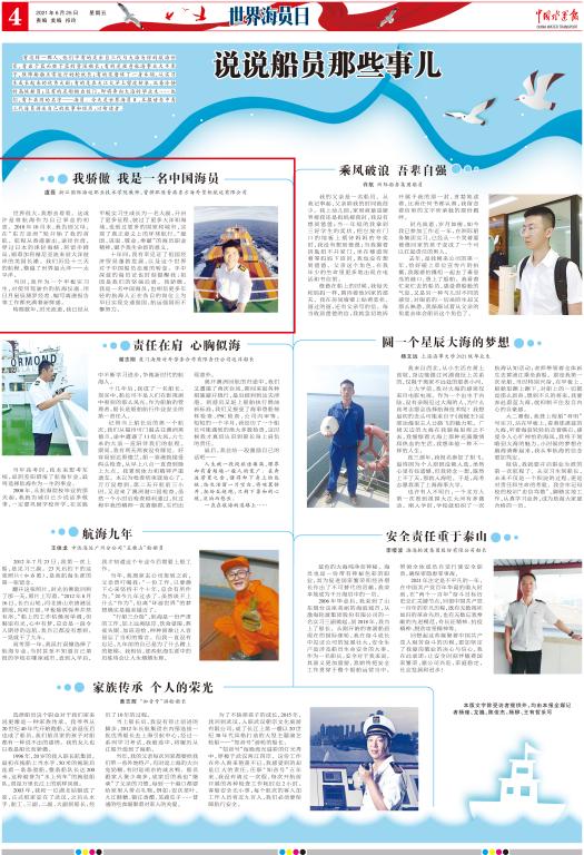 世界很大,我想去看看。这或许是将航海作为自己事业的初衷。2010年10月末,我告别父母,在“东方亚洲 ”轮开始了我的首航。航程从香港驶出,途径台湾,穿过日本的津轻海峡、阿留申群岛,顺着加利福尼亚流来到大洋彼岸的美国长滩。我们历经十三天的航程,横越了世界最大洋——太平洋。当时,我作为一个甲板实习生,对使用驾驶台的航海仪器、用日月星辰测罗经差、编写离港报告等工作都充满着新鲜感。 转眼数年,时光流逝,我已经从甲板实习生成长为一名大副,开启了更多征程,驶过了更多大洋和海域,也到过更多的国家和城市,实现了真正意义上的环球航行。“爱国、进取、敬业、奉献”的海员职业精神,赋予我生命新的意义。十年间,我有幸见证了祖国经济贸易蓬勃发展,以及这个世界对于中国船员态度的转变。手中深蓝的海员证也时刻提醒我:祖国是我们的坚强后盾。我骄傲,我是一名中国海员,也相信更多年轻的航海人正在各自的岗位上为早日实现交通强国、航运强国而不懈努力。