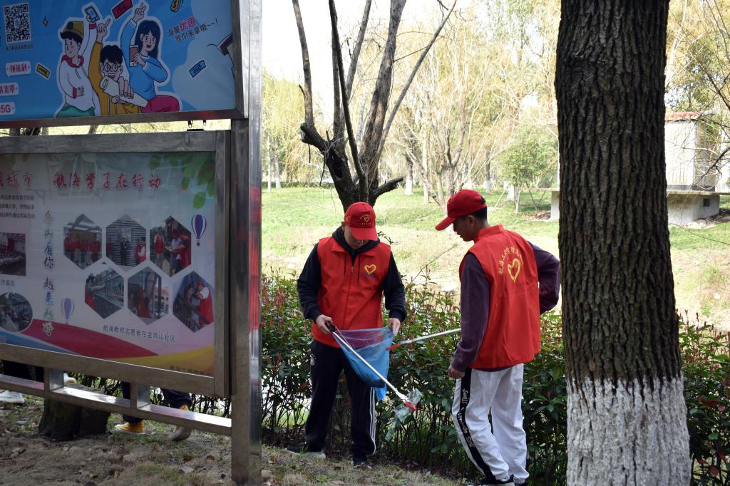 活动中,航海青年志愿者们身着红色马甲,头戴小红帽,青春飞扬、活力四射。他们两两一组,一个手拿夹子,另一个手拿垃圾袋,化身为校园小精灵,穿梭在河道旁,弯腰,耐心捡拾发现的垃圾。