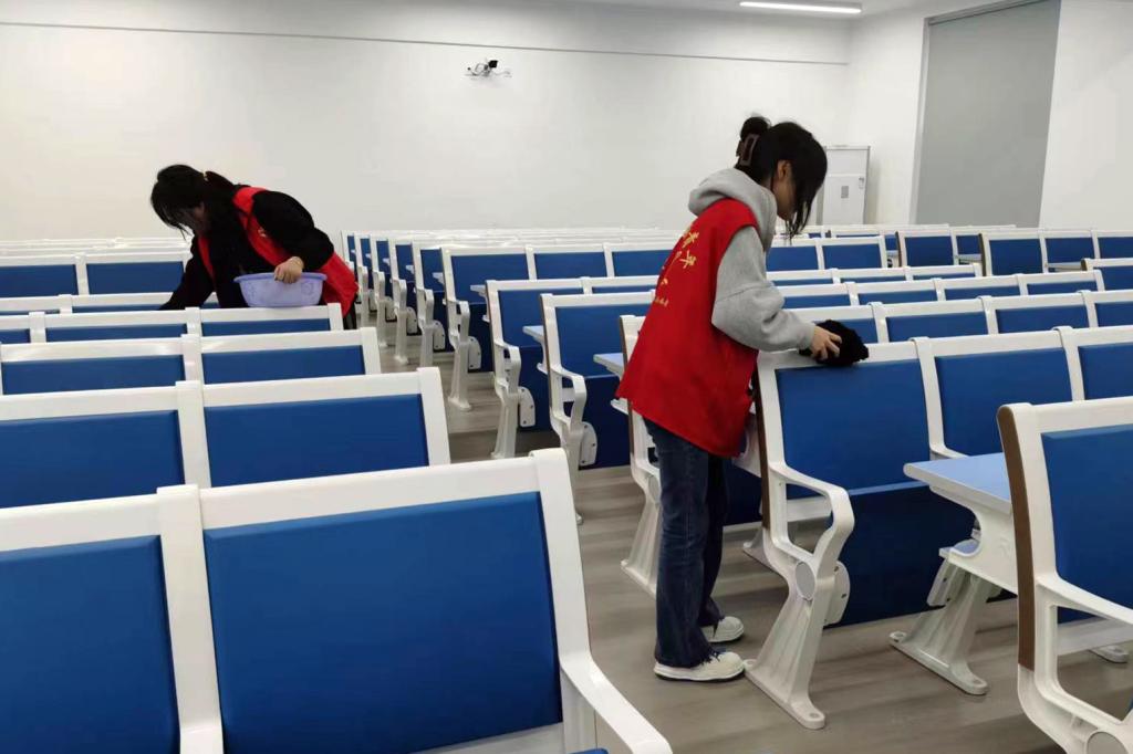 同学们组织有序,分工明确,干劲十足,拿起抹布、扫帚、拖把、刷子等工具,认真打扫地面,清理垃圾,擦洗桌椅、门窗、玻璃、墙壁等区域,不留死角。